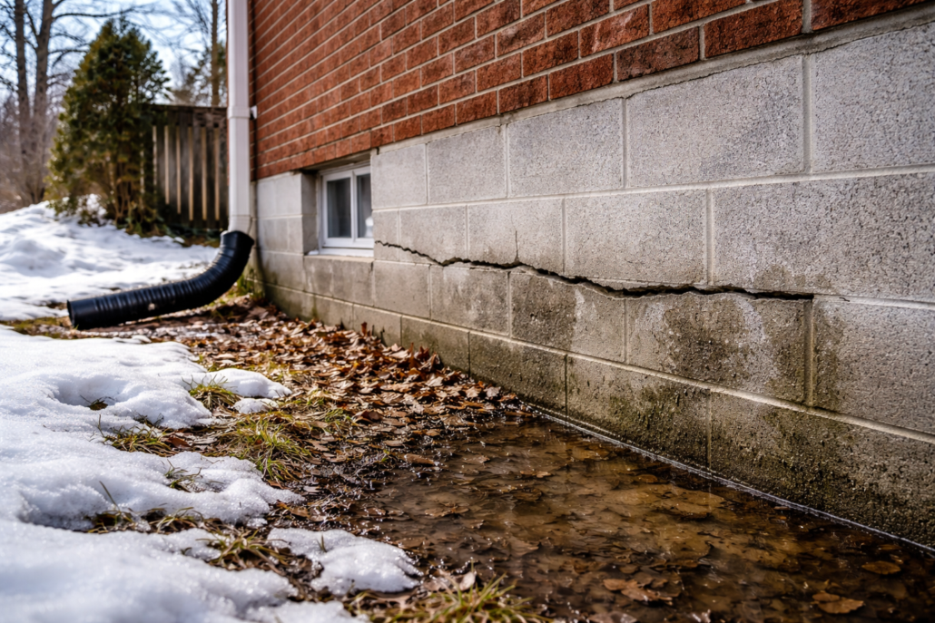 The pattern usually starts with moisture. Water may collect against the foundation because of poor grading, short downspouts, clogged gutters, compacted snow, heavy rain, or saturated soil. Once water is present, freezing temperatures change the equation. As water freezes, it expands. That expansion can increase pressure inside cracks and in the soil against the exterior wall. When temperatures rise, the ice melts, the pressure changes, and the cycle starts over again the next time temperatures drop. Over time, repeated movement can open cracks wider, allow more water in, and increase the amount of stress placed on foundation walls.